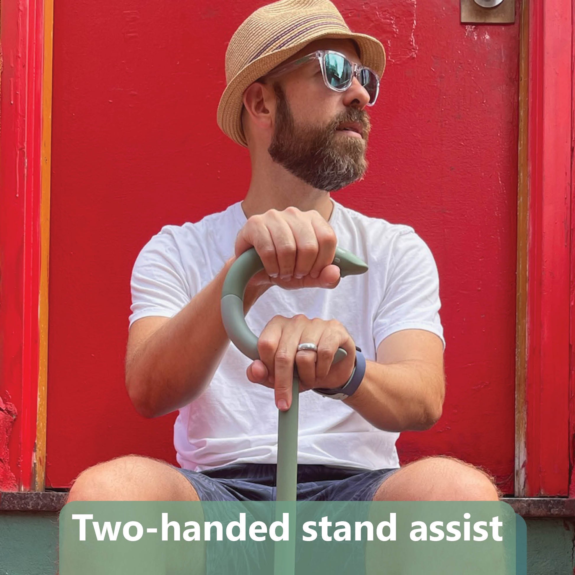 The open C shape gives both hands a place to grip simultaneously, something no traditional hook cane offers. Both hands engage, the leverage shifts, and standing from a chair, sofa, or low seat takes less effort than before.