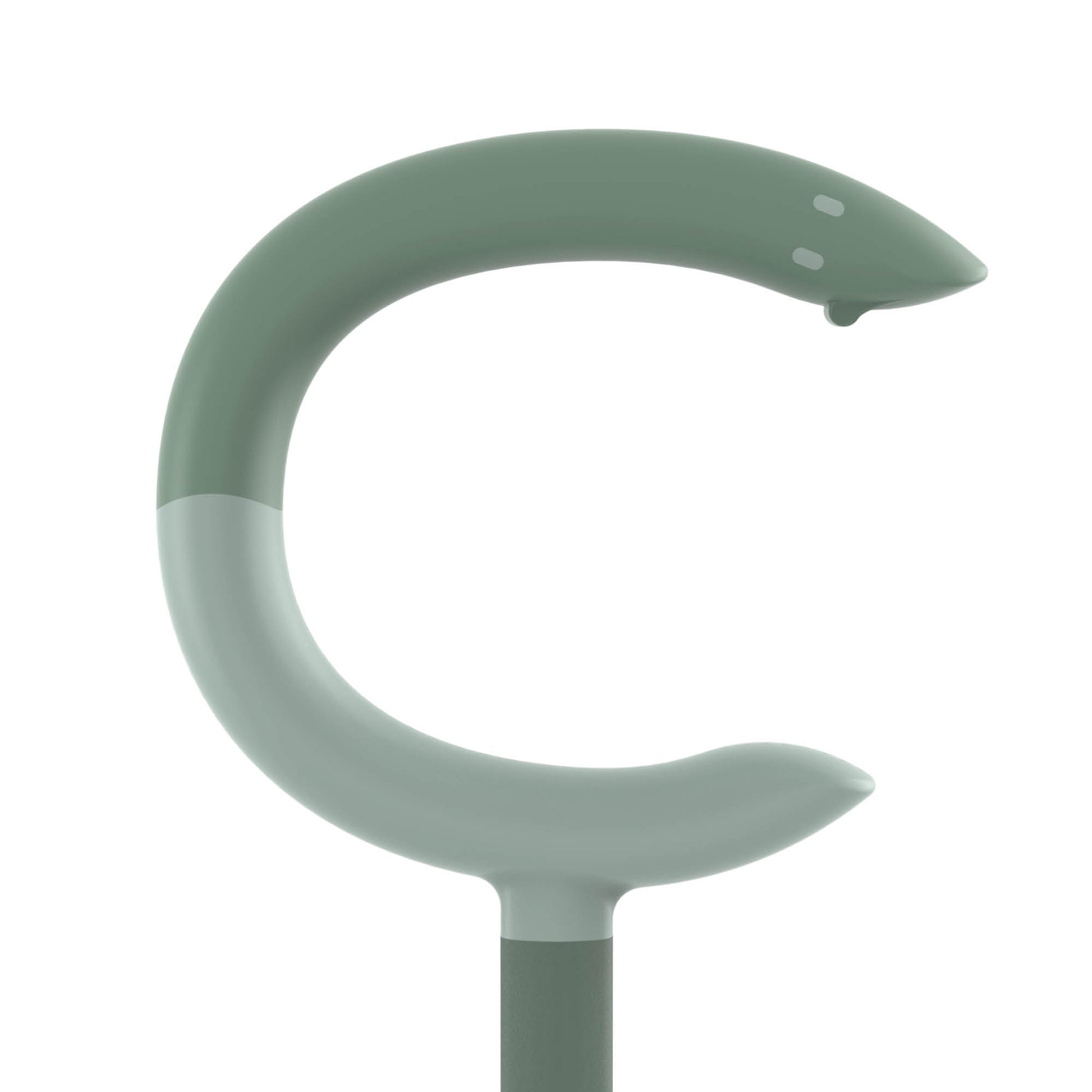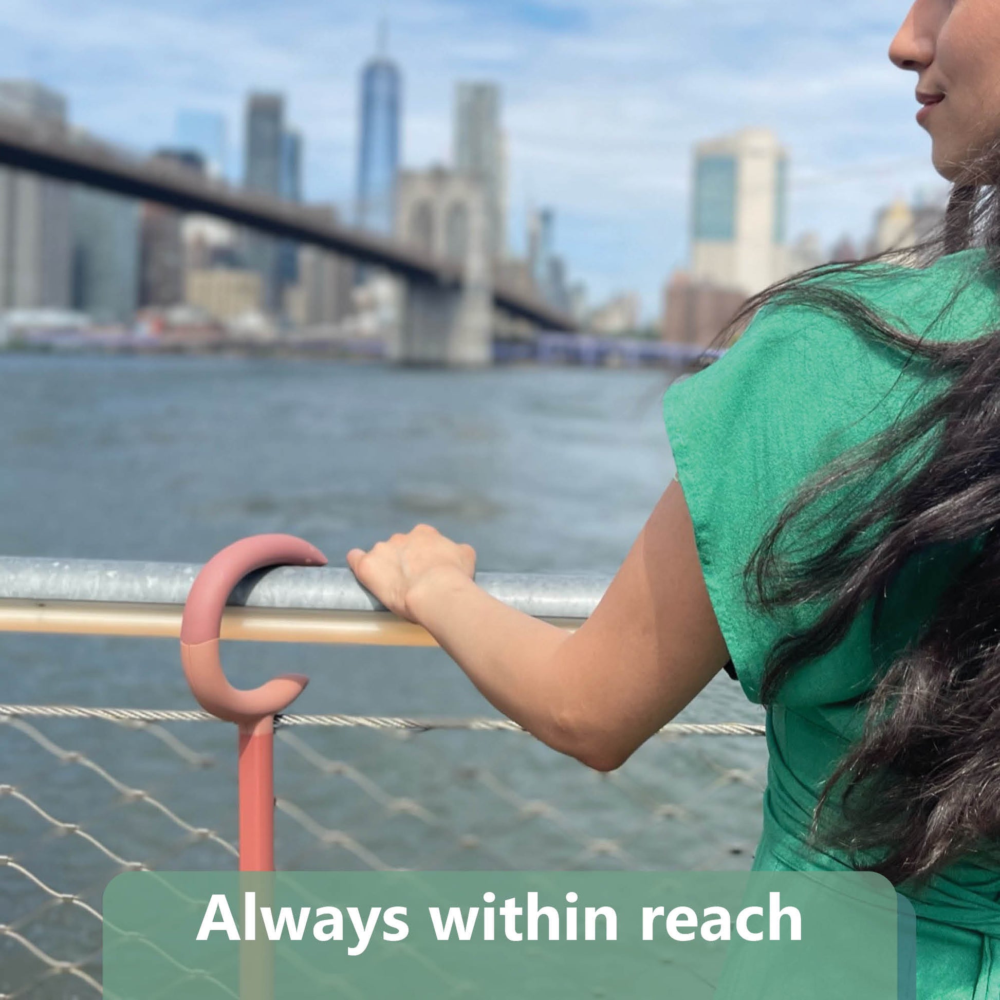 The hook form keeps the cane close without occupying your hand. Hangs over a table edge, a counter, or your arm between uses.
